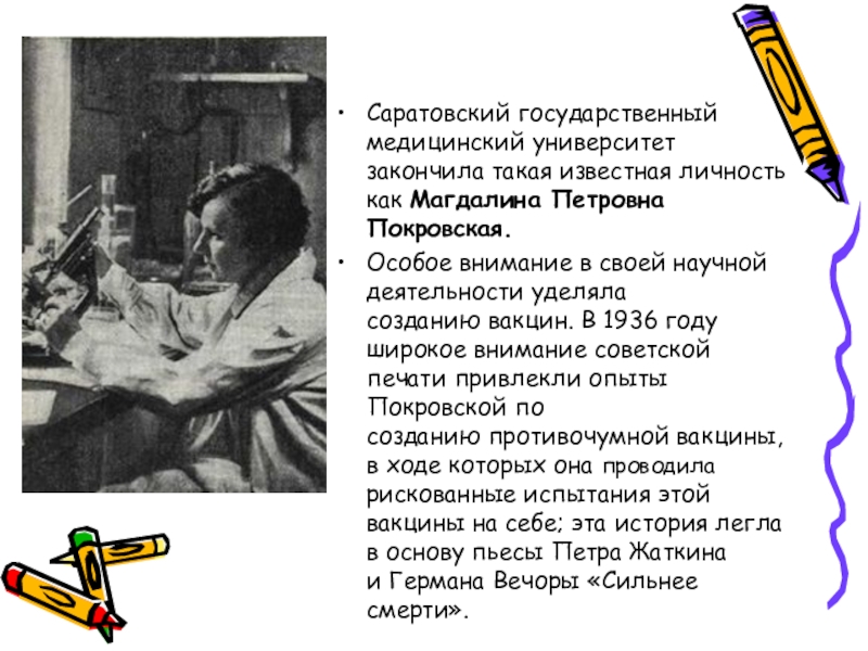 Слайд 14Саратовский государственный медицинский университет закончила такая известная личность как Магдалина Петровна