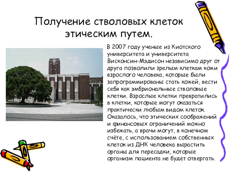 ученые из Киотского университета и университета Висконсин-Мэдисон независимо друг от друга позволили зрелым клеткам кожи взрослого человека, которые были запрограммированы стать кожей, вести себя как эмбриональные стволовые клетки. Взрослые клетки превратились в клетки, которые могут оказаться практически любым видом клеток. Оказалось, что этических соображений и финансовых ограничений можно избежать, а врачи могут, в конечном счёте, с использованием собственных клеток из ДНК человека вырастить органы для пересадки, которые организм пациента не будет отвергать.