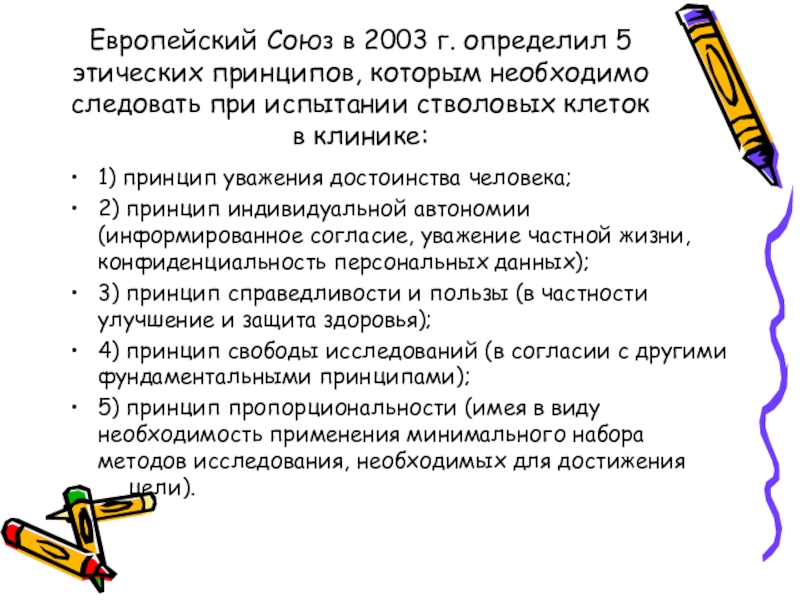 Слайд 10Европейский Союз в 2003 г. определил 5 этических принципов, которым необходимо