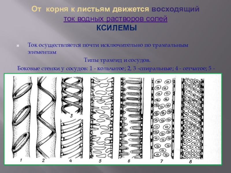 Боковые стенки у сосудов: 1 - кольчатое; 2, 3 -спиральные; 4 - сетчатое; 5 - лестничное; 6 – супротивное
