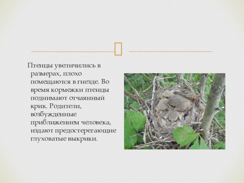 Слайд 19 Птенцы увеличились в размерах, плохо помещаются в гнезде. Во
