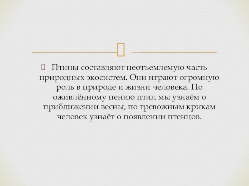 природе и жизни человека. По оживлённому пению птиц мы узнаём о приближении весны, по тревожным крикам человек узнаёт о появлении птенцов.