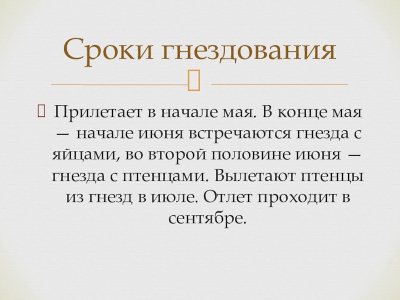 Слайд 12Прилетает в начале мая. В конце мая — начале июня встречаются
