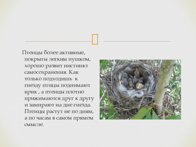 Слайд 18 Птенцы более активные, покрыты легким пушком, хорошо развит инстинкт