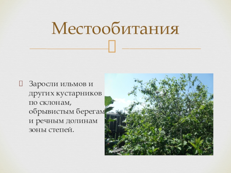 Заросли ильмов и других кустарников по склонам, обрывистым берегам и речным