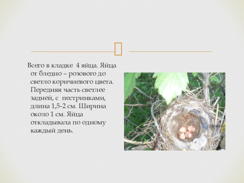 Слайд 15 Всего в кладке 4 яйца. Яйца от бледно –