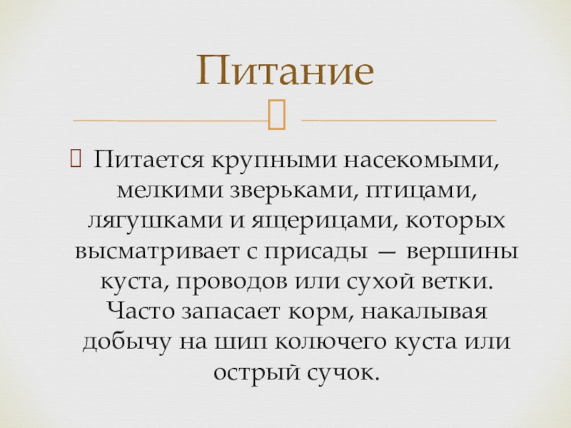 с присады — вершины куста, проводов или сухой ветки. Часто запасает корм, накалывая добычу на шип колючего куста или острый сучок.