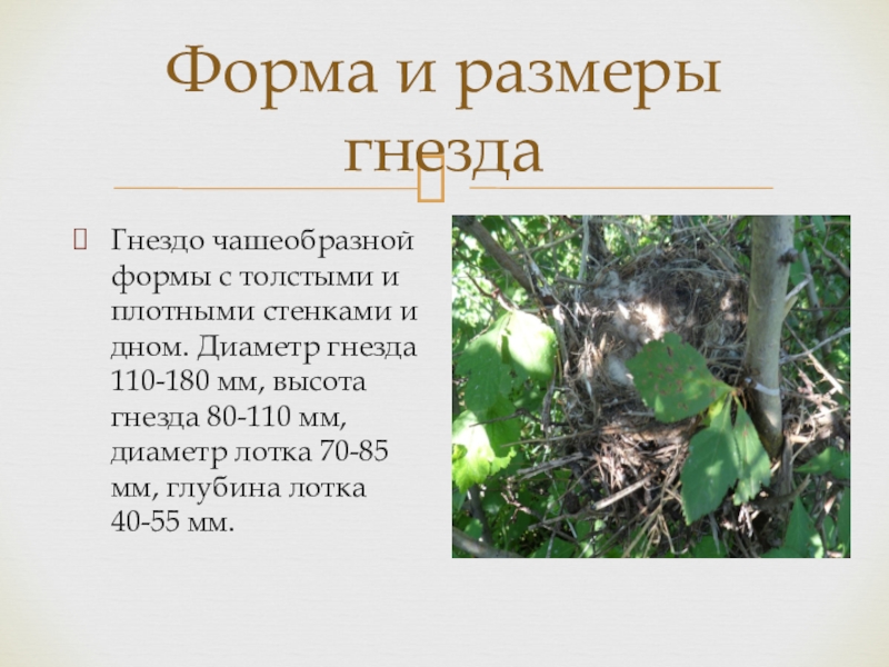 и дном. Диаметр гнезда 110-180 мм, высота гнезда 80-110 мм, диаметр лотка 70-85 мм, глубина лотка 40-55 мм.