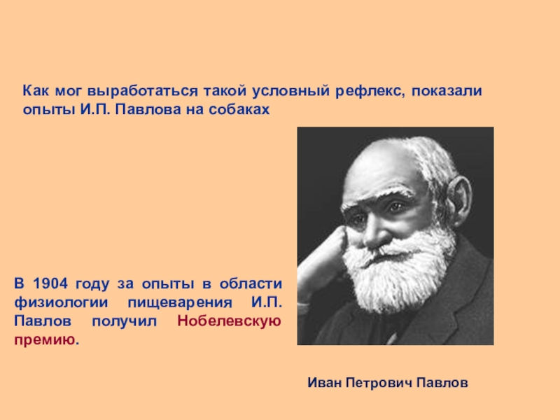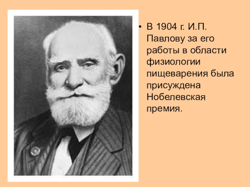 В 1904 году за опыты в области физиологии пищеварения И.П. Павлов получил Нобелевскую премию.