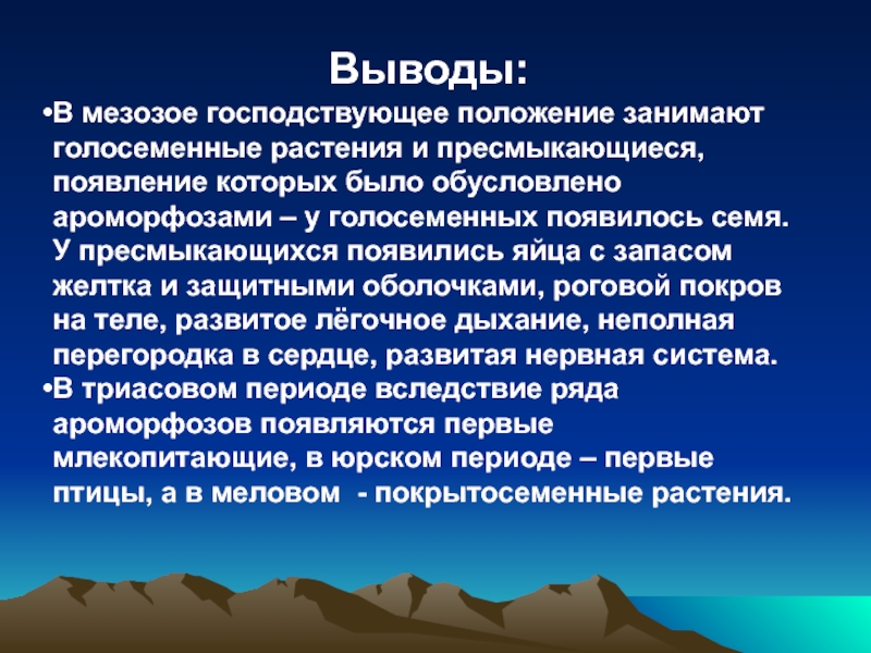 было обусловлено ароморфозами – у голосеменных появилось семя. У пресмыкающихся появились яйца с запасом желтка и защитными оболочками, роговой покров на теле, развитое лёгочное дыхание, неполная перегородка в сердце, развитая нервная система.