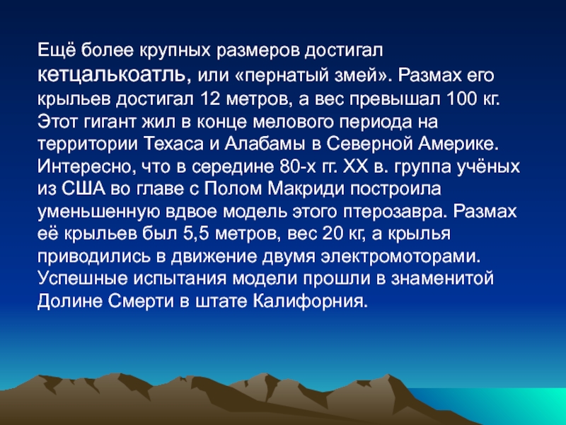 крыльев достигал 12 метров, а вес превышал 100 кг. Этот гигант жил в конце мелового периода на территории Техаса и Алабамы в Северной Америке. Интересно, что в середине 80-х гг. XX в. группа учёных из США во главе с Полом Макриди построила уменьшенную вдвое модель этого птерозавра. Размах её крыльев был 5,5 метров, вес 20 кг, а крылья приводились в движение двумя электромоторами. Успешные испытания модели прошли в знаменитой Долине Смерти в штате Калифорния.