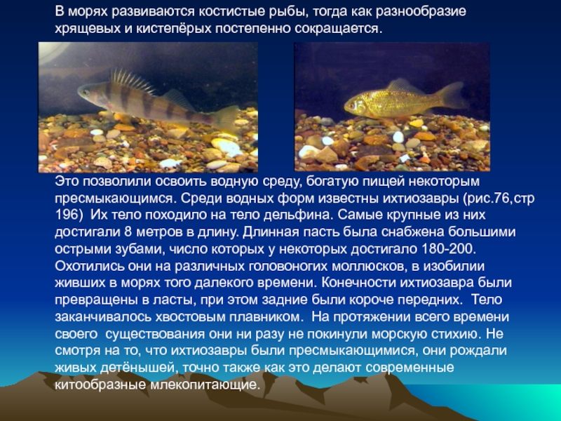 Слайд 11В морях развиваются костистые рыбы, тогда как разнообразие хрящевых и кистепёрых
