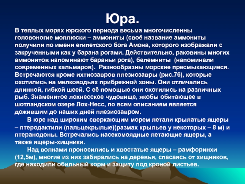аммониты (своё название аммониты получили по имени египетского бога Амона, которого изображали с закрученными как у барана рогами. Действительно, раковины многих аммонитов напоминают бараньи рога), белемниты (напоминали современных кальмаров). Разнообразны морские пресмыкающиеся. Встречаются кроме ихтиозавров плезиозавры (рис.76), которые охотились на мелководьях прибрежной зоны. Они отличались длинной, гибкой шеей. С её помощью они охотились на различных рыб. Знаменитое лохнесское чудовище, якобы обитающее в шотландском озере Лох-Несс, по всем описаниям является дожившим до наших дней плезиозавром.