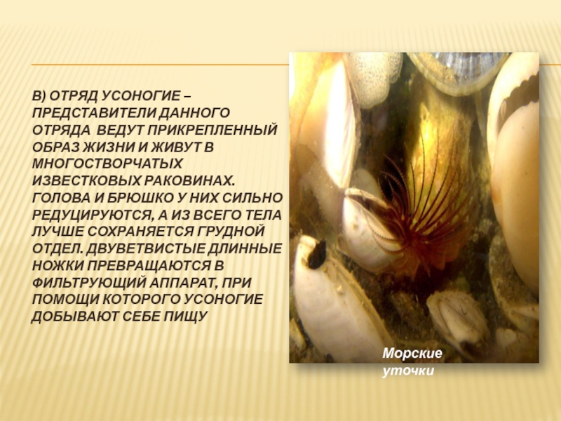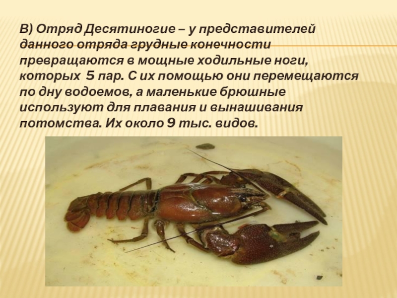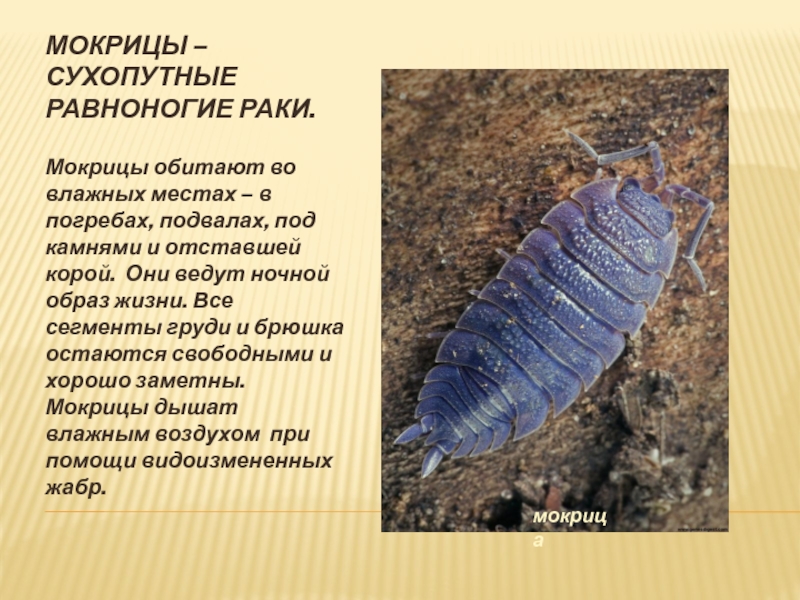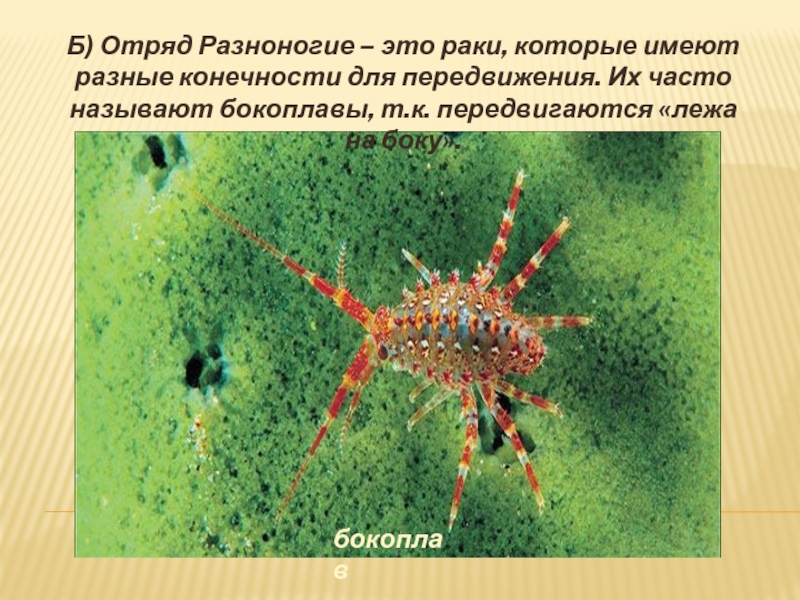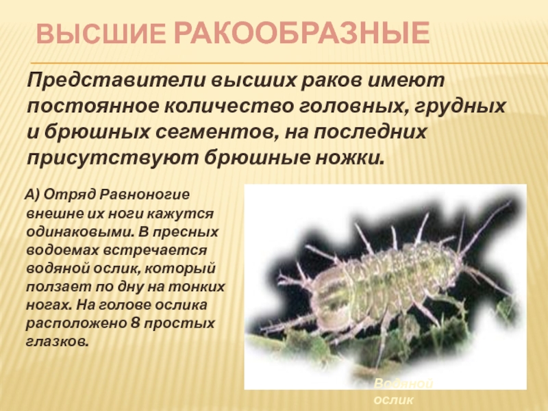 А) Отряд Равноногие внешне их ноги кажутся одинаковыми. В пресных водоемах встречается водяной ослик, который ползает по дну на тонких ногах. На голове ослика расположено 8 простых глазков.