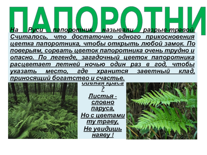 На Руси папоротник называли разрыв-травой. Считалось, что достаточно одного прикосновения цветка папоротника, чтобы открыть любой замок. По поверьям, сорвать цветок папоротника очень трудно и опасно. По легенде, загадочный цветок папоротника расцветает летней ночью один раз в год, чтобы указать место, где хранится заветный клад, приносящий богатство и счастье.