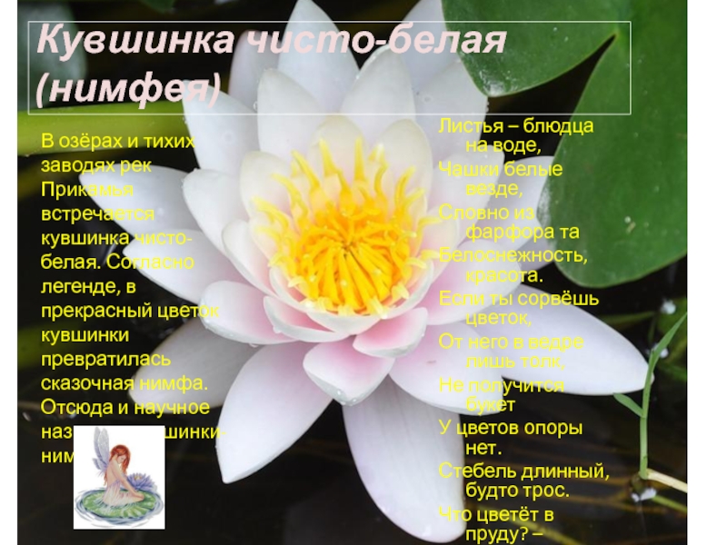 В озёрах и тихих заводях рек Прикамья встречается кувшинка чисто-белая. Согласно легенде, в прекрасный цветок кувшинки превратилась сказочная нимфа. Отсюда и научное название кувшинки-нимфея.