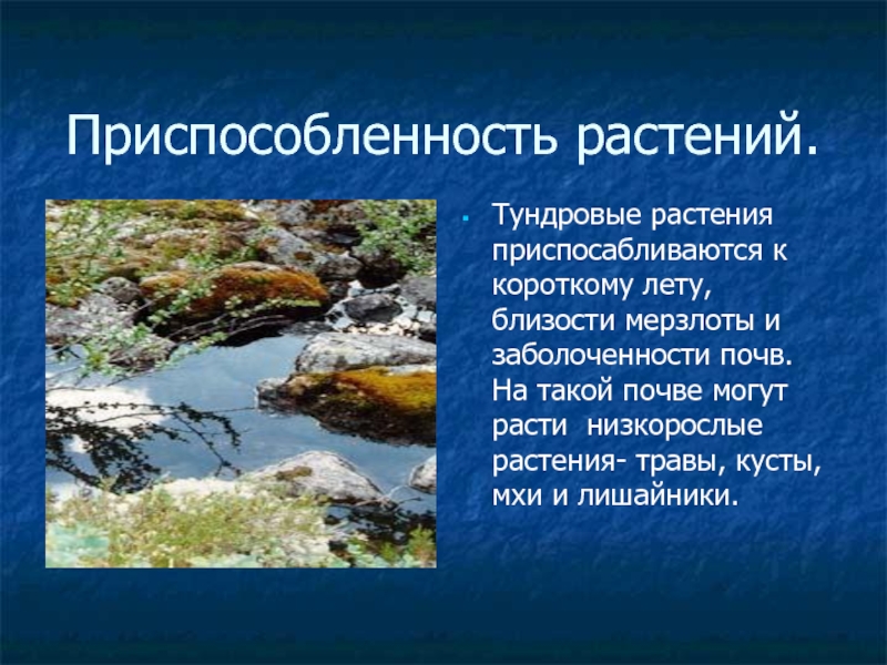 Приспособленность растений. Тундровые растения приспосабливаются к короткому лету, близости мерзлоты и заболоченности почв. На такой почве могут