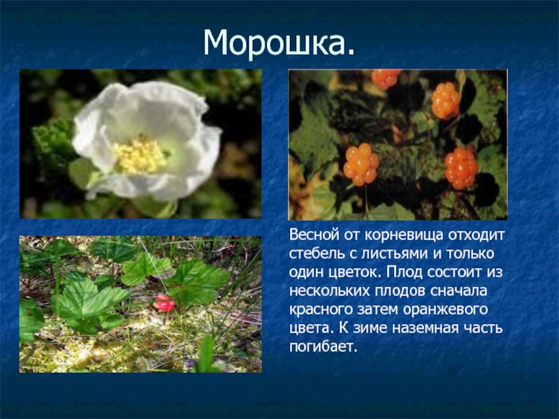 Морошка.Весной от корневища отходит стебель с листьями и только один цветок. Плод состоит из нескольких плодов сначала