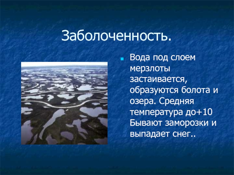 Заболоченность.Вода под слоем мерзлоты застаивается, образуются болота и озера. Средняя температура до+10 Бывают заморозки и выпадает снег..