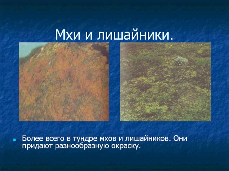 Мхи и лишайники.Более всего в тундре мхов и лишайников. Они придают разнообразную окраску.