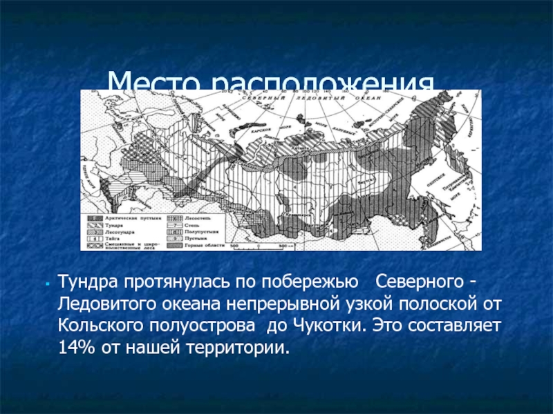 Место расположения.Тундра протянулась по побережью 	Северного - Ледовитого океана непрерывной узкой полоской от Кольского полуострова до Чукотки.