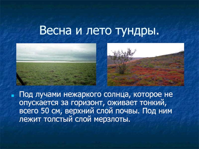 Весна и лето тундры.Под лучами нежаркого солнца, которое не опускается за горизонт, оживает тонкий, всего 50 см,
