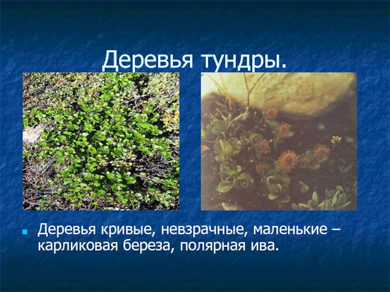 Деревья тундры.Деревья кривые, невзрачные, маленькие – карликовая береза, полярная ива.