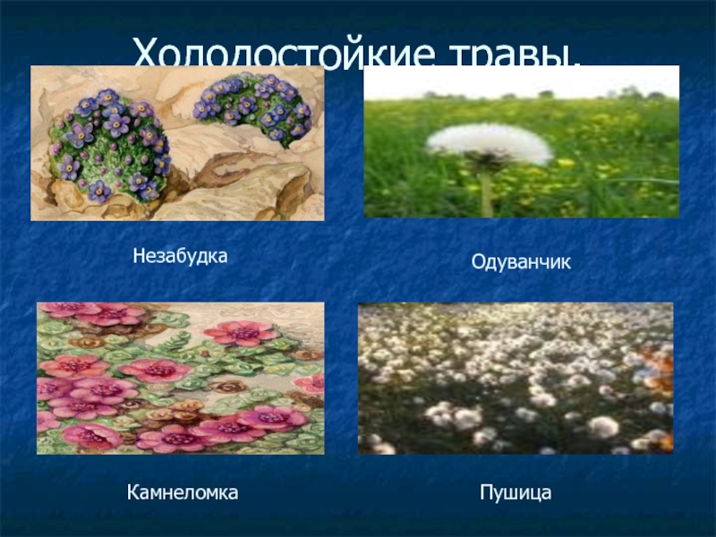 Холодостойкие травы.НезабудкаОдуванчикКамнеломкаПушица