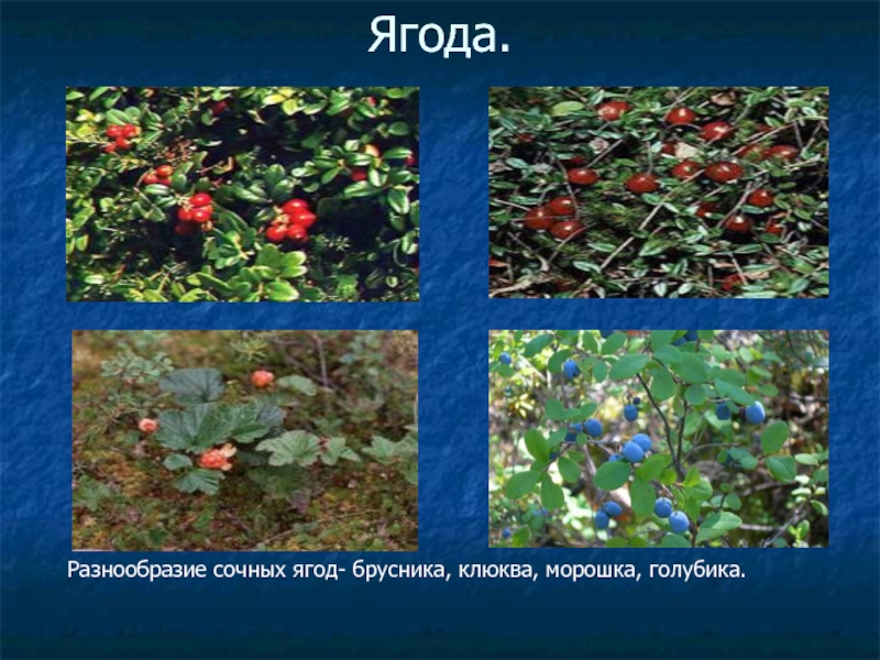 Ягода.Разнообразие сочных ягод- брусника, клюква, морошка, голубика.