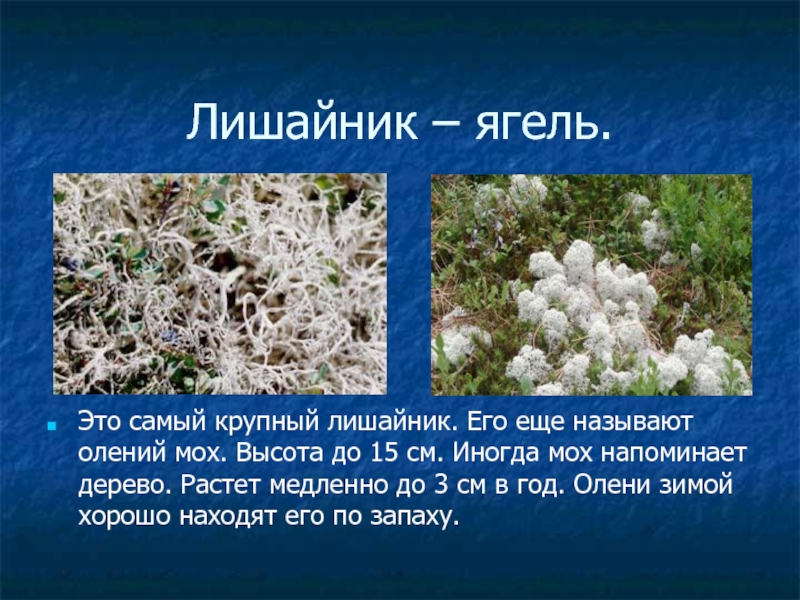 Лишайник – ягель.Это самый крупный лишайник. Его еще называют олений мох. Высота до 15 см. Иногда мох