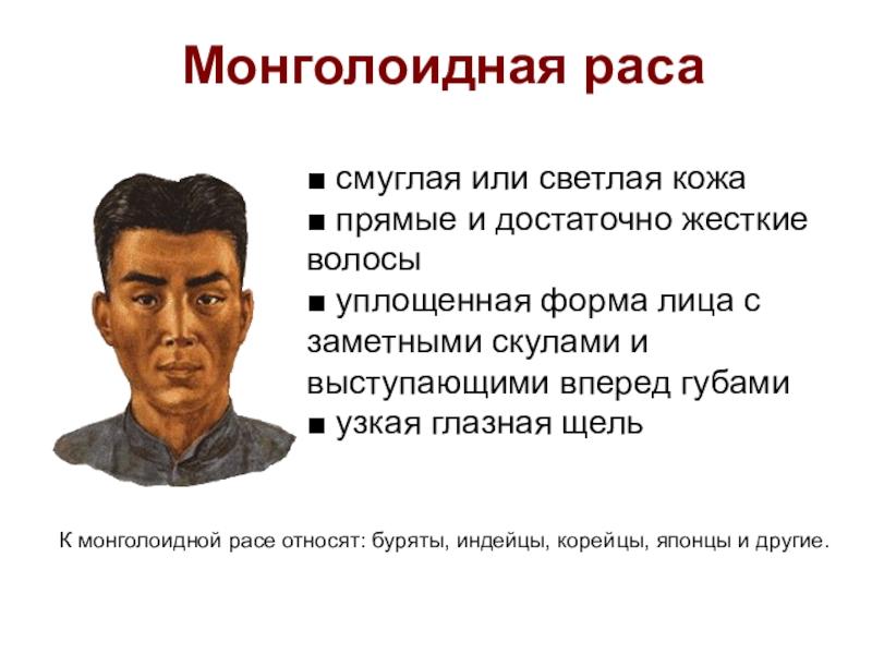 К монголоидной расе относят: буряты, индейцы, корейцы, японцы и другие.