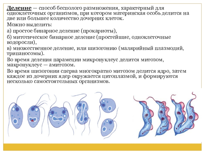 Слайд 4Деление — способ бесполого размножения, характерный для одноклеточных организмов, при котором