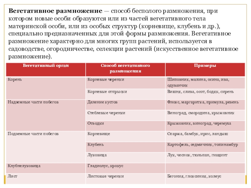 Слайд 6Вегетативное размножение — способ бесполого размножения, при котором новые особи образуются