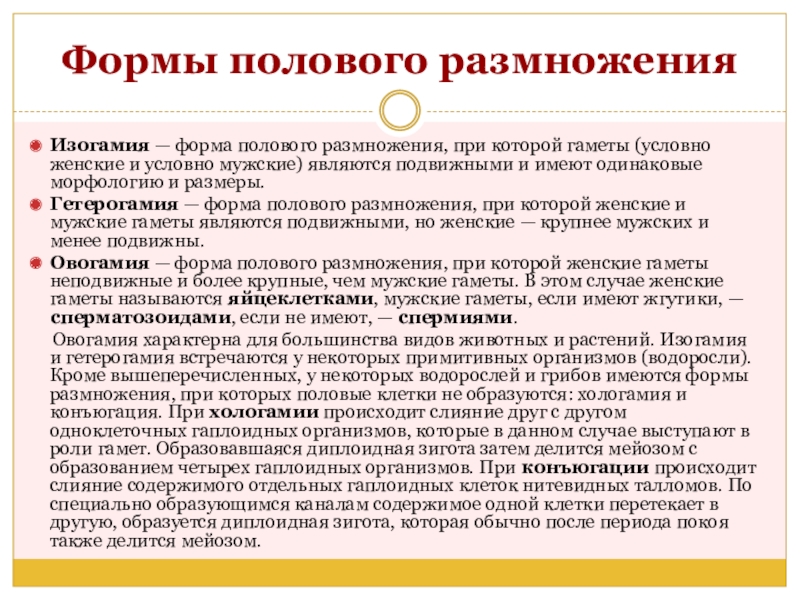 женской), у которых в особых органах образуются специализированные клетки — гаметы. Процесс формирования гамет называется гаметогенезом, основным этапом гаметогенеза является мейоз. Дочернее поколение развивается из зиготы — клетки, образовавшейся в результате слияния мужской и женской гамет. Процесс слияния мужской и женской гамет называется оплодотворением. Обязательным следствием полового размножения является перекомбинация генетического материала у дочернего поколения.