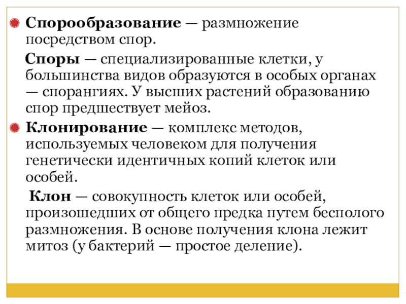 Клон — совокупность клеток или особей, произошедших от общего предка путем бесполого размножения. В основе получения клона лежит митоз (у бактерий — простое деление).