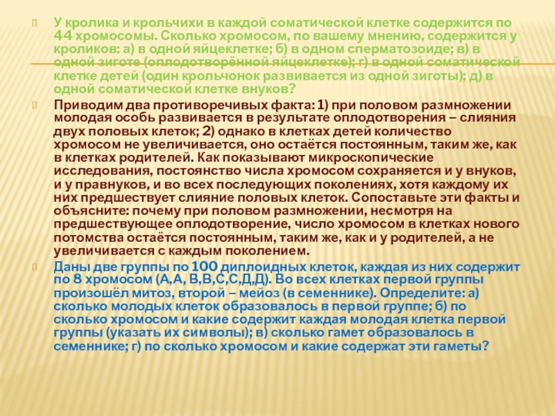 хромосомы. Сколько хромосом, по вашему мнению, содержится у кроликов: а) в одной яйцеклетке; б) в одном сперматозоиде; в) в одной зиготе (оплодотворённой яйцеклетке); г) в одной соматической клетке детей (один крольчонок развивается из одной зиготы); д) в одной соматической клетке внуков?