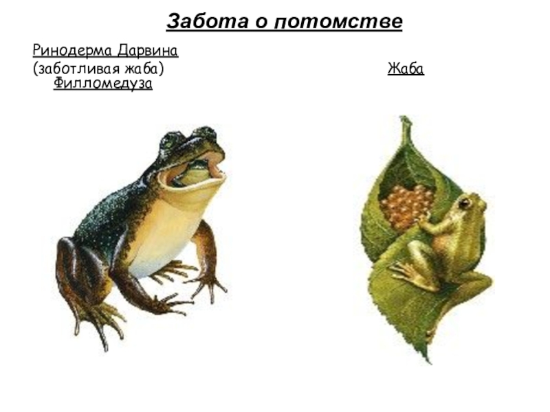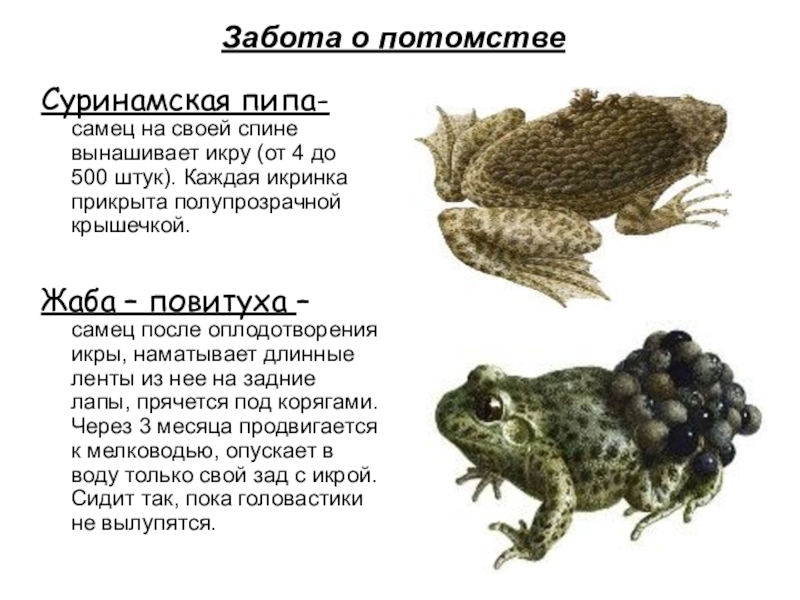 Жаба – повитуха – самец после оплодотворения икры, наматывает длинные ленты из нее на задние лапы, прячется под корягами. Через 3 месяца продвигается к мелководью, опускает в воду только свой зад с икрой. Сидит так, пока головастики не вылупятся.
