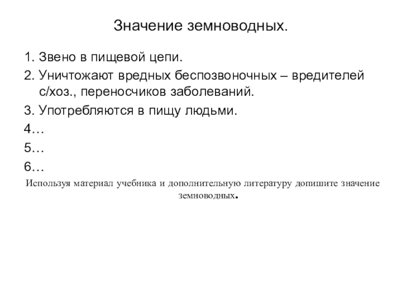 Используя материал учебника и дополнительную литературу допишите значение земноводных.