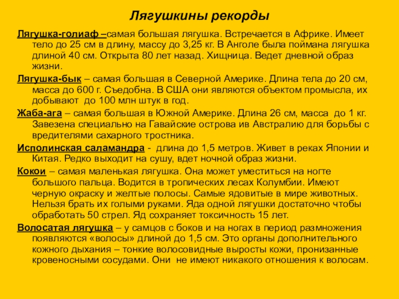 Лягушка-голиаф –самая большая лягушка. Встречается в Африке. Имеет тело до
