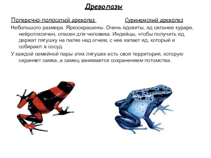 Небольшого размера. Яркоокрашены. Очень ядовиты, яд сильнее кураре, нейротоксичен, опасен для человека. Индейцы, чтобы получить яд, держат лягушку на палке над огнем, с нее капает яд, который и собирают в сосуд.