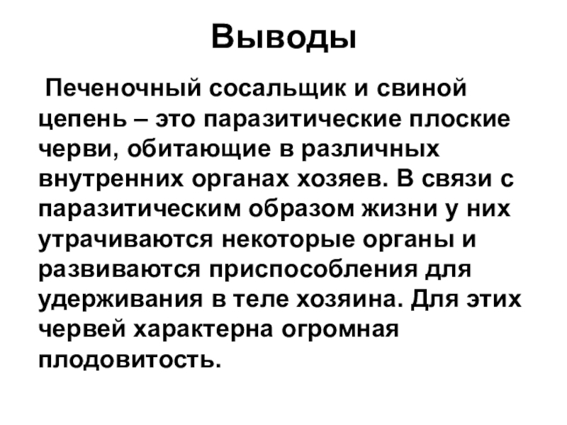 Выводы	Печеночный сосальщик и свиной цепень – это паразитические плоские черви, обитающие в различных внутренних органах хозяев. В
