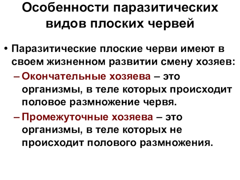 Особенности паразитических видов плоских червейПаразитические плоские черви имеют в своем жизненном развитии смену хозяев:Окончательные хозяева – это