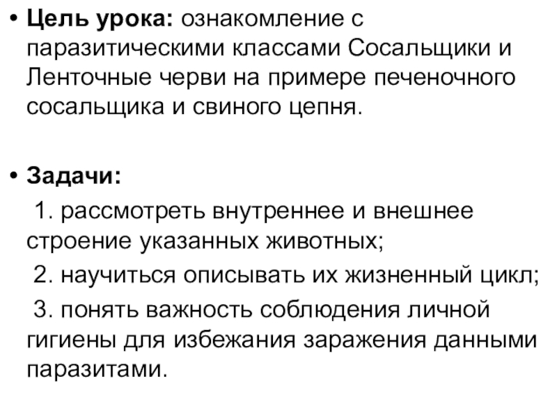 Цель урока: ознакомление с паразитическими классами Сосальщики и Ленточные черви на примере печеночного сосальщика и свиного цепня.Задачи: 1. рассмотреть внутреннее и внешнее строение указанных животных; 2. научиться описывать их жизненный цикл; 3. понять важность соблюдения личной гигиены для