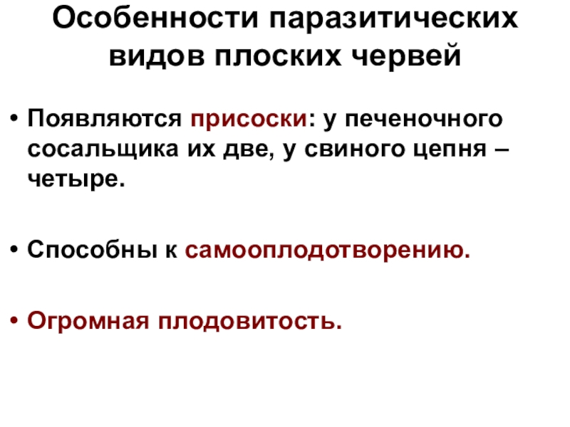 Особенности паразитических видов плоских червейПоявляются присоски: у печеночного сосальщика их две, у свиного цепня – четыре.Способны к
