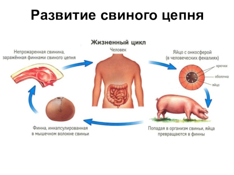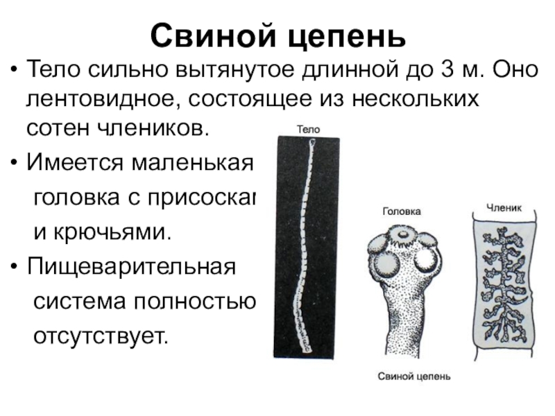 Свиной цепеньТело сильно вытянутое длинной до 3 м. Оно лентовидное, состоящее из нескольких сотен члеников.Имеется маленькая	головка с