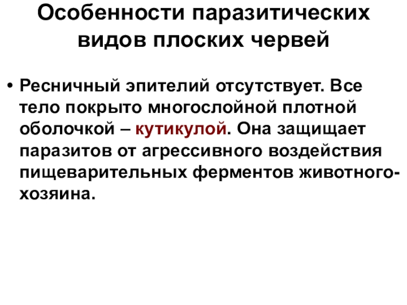 Особенности паразитических видов плоских червейРесничный эпителий отсутствует. Все тело покрыто многослойной плотной оболочкой – кутикулой. Она защищает