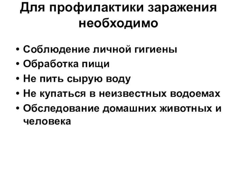 Для профилактики заражения необходимоСоблюдение личной гигиеныОбработка пищиНе пить сырую водуНе купаться в неизвестных водоемахОбследование домашних животных и