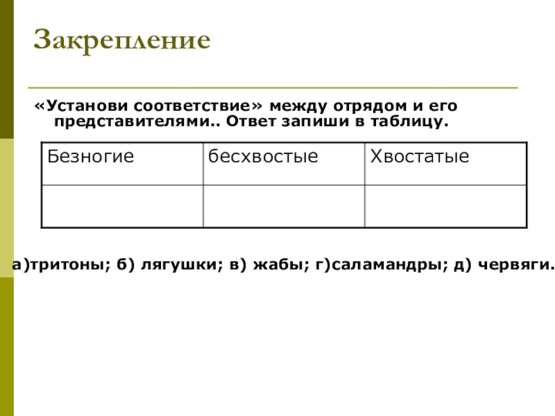2.Уметь различать отряды земноводных.