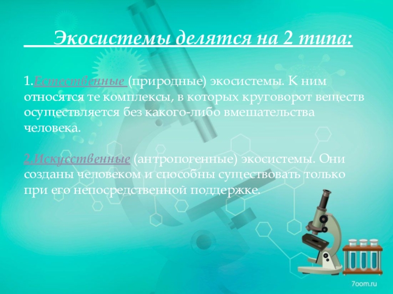 2.Искусственные (антропогенные) экосистемы. Они созданы человеком и способны существовать только при его непосредственной поддержке.