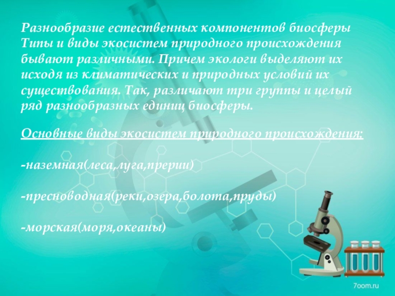 Слайд 7Разнообразие естественных компонентов биосферы Типы и виды экосистем природного происхождения бывают